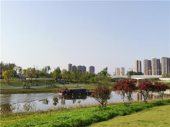 5月8日上午,銅梁區淮遠河原鄉中央公園段,游客乘坐觀光船在河面上游覽。銅梁區淮遠河上的游船。通訊員 陳剛 攝“河面很干凈,水質很清澈
