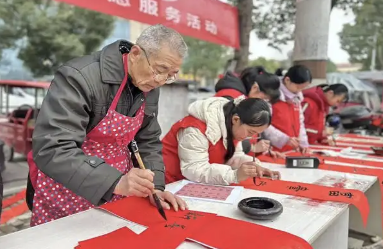 2月1日,重慶市銅梁區第一實驗小學高新校區的師生代表走進轄區社區,開展“墨香書藝在行動,詩情畫意頌龍鄉”主題送春聯活動。紅紙鋪展,筆