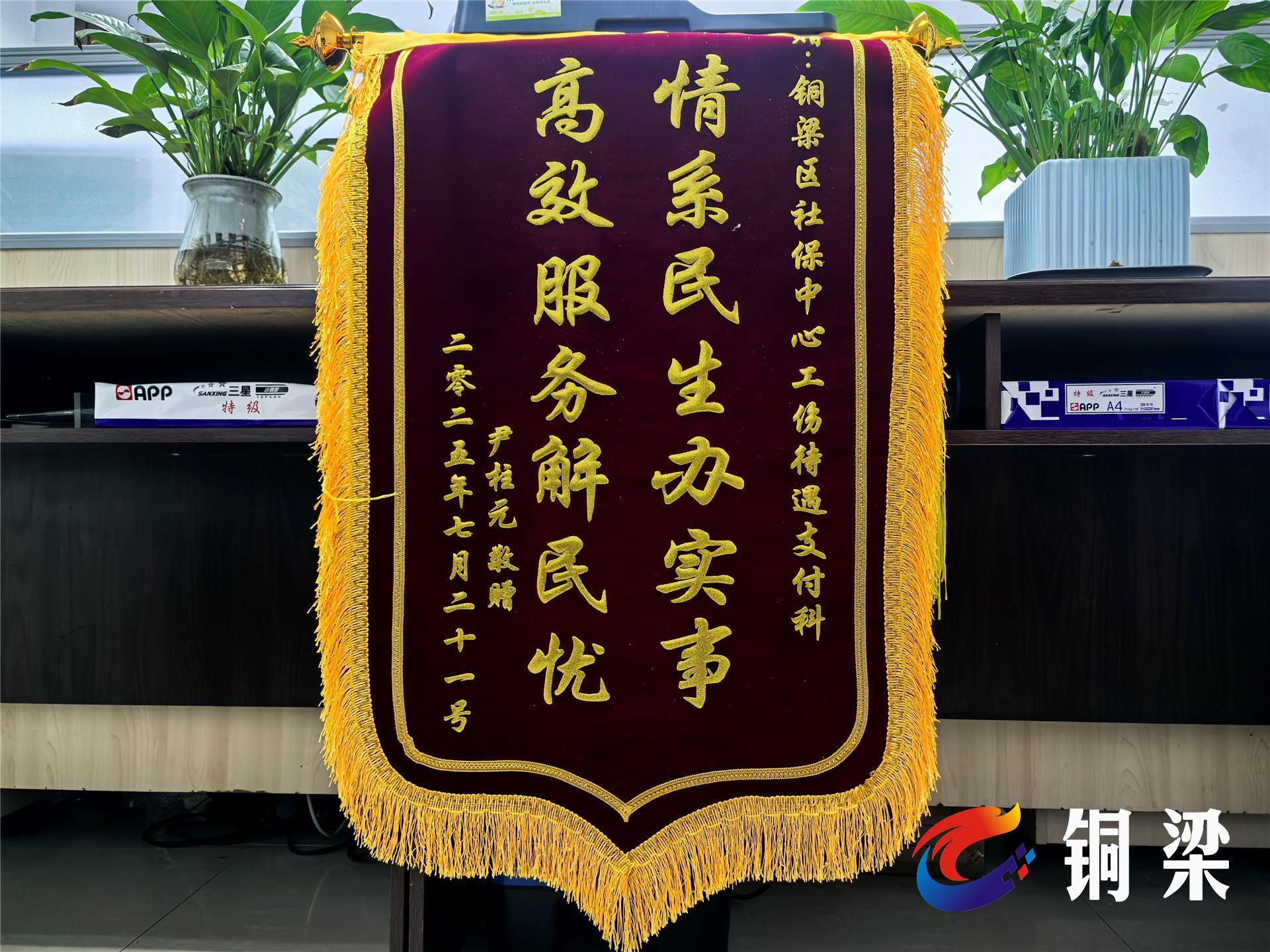 7月21日,一面書寫著“情系民生辦實事 高效服務解民憂”的錦旗,送進了銅梁區人力社保局社保中心工傷保險待遇審核科,市民尹柱元以此感謝